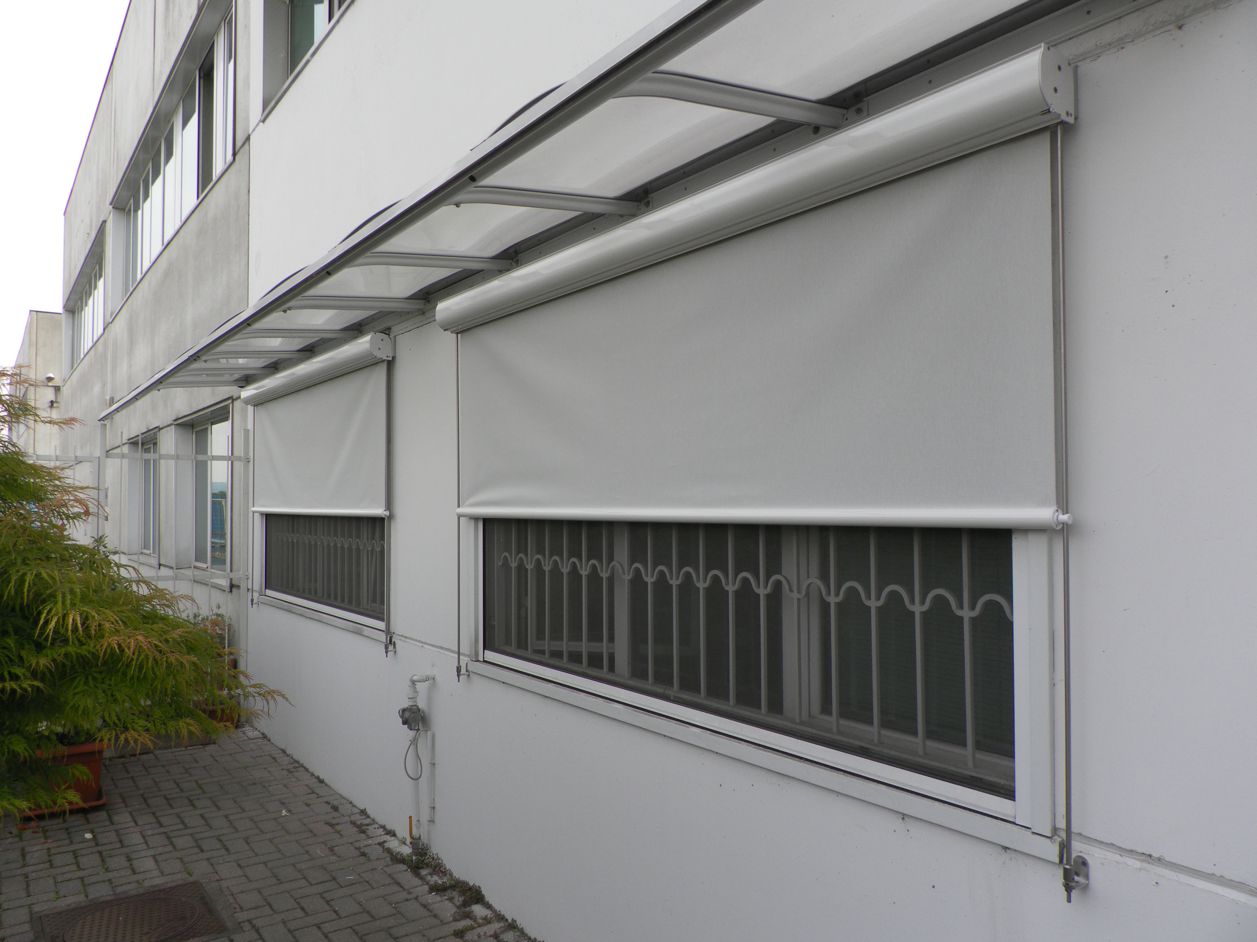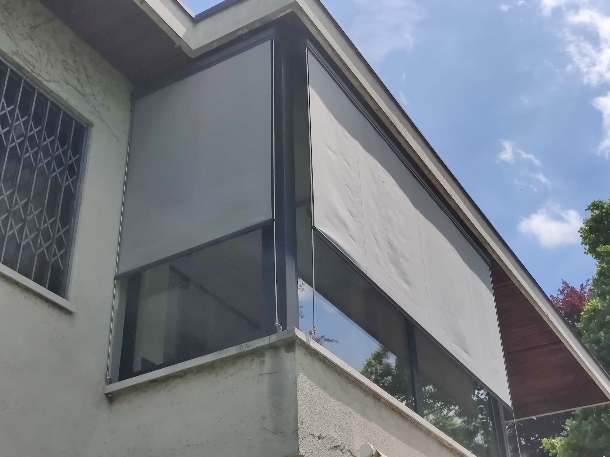 La tenda a caduta verticale è realizzata con tessuti acrilici e PVC oscuranti, filtranti o trasparenti, con struttura in alluminio e finiture verniciate in tinte RAL, una soluzione particolarmente indicata per abbinarsi agli arredi moderni. La tenda è disponibile anche in ferro battuto, rifacendosi alla tradizione dell'artigianato medievale, così da essere perfetta per il centro storico o per edifici in stile. Ogni modello può essere dotato di braccetti sporgenti con cui chiudere sia frontalmente sia lateralmente logge, balconi e porticati. L'installazione delle tende può variare a seconda delle esigenze e possono essere guidate lateralmente tramite guide in alluminio, cavetto o tondino in acciaio inox, soluzione ideale per le zone ventose e per la copertura di vetrate esterne scoperte.